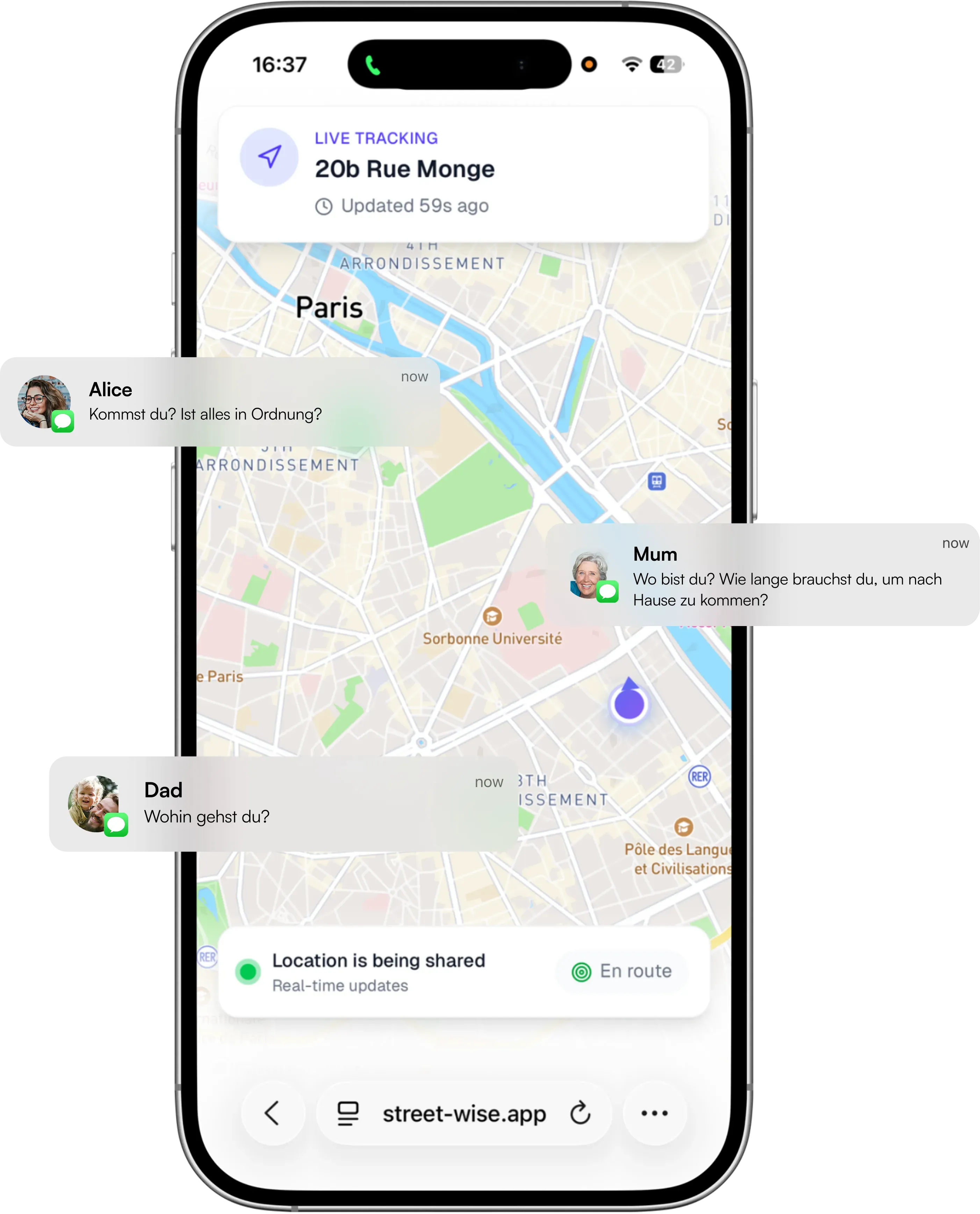 Teile deine Echtzeit-Position mit vertrauten Kontakten, während du gehst. Sie verfolgen deine Route live auf einer Karte — keine App auf ihrer Seite nötig. Ein Link. Volle Sichtbarkeit.