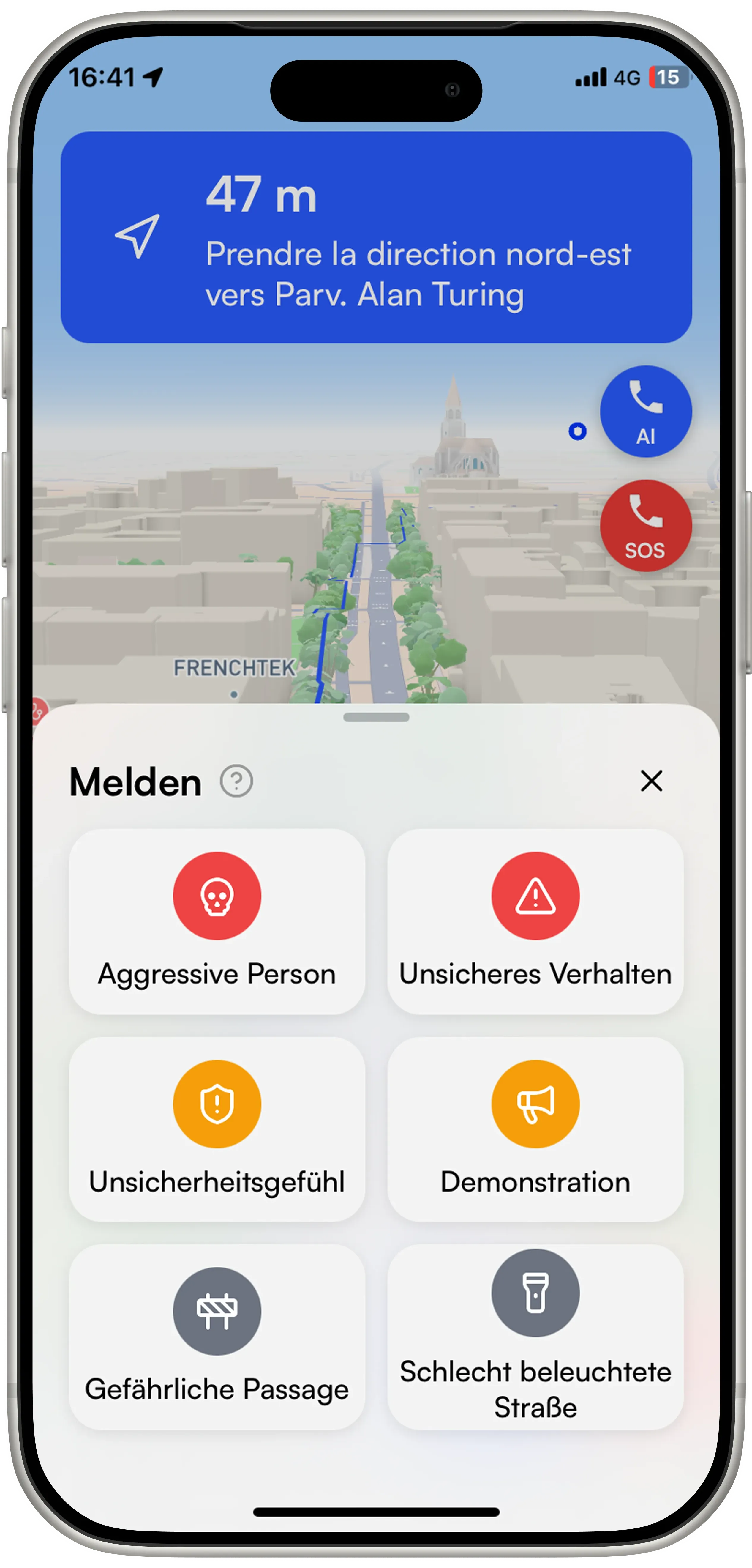 Melde Auffälligkeiten: von schlechter Beleuchtung bis hin zu verdächtigen Aktivitäten in nur wenigen Sekunden. Dein Beitrag hilft, Routen zu verbessern und die Stadt sicherer für alle zu machen.